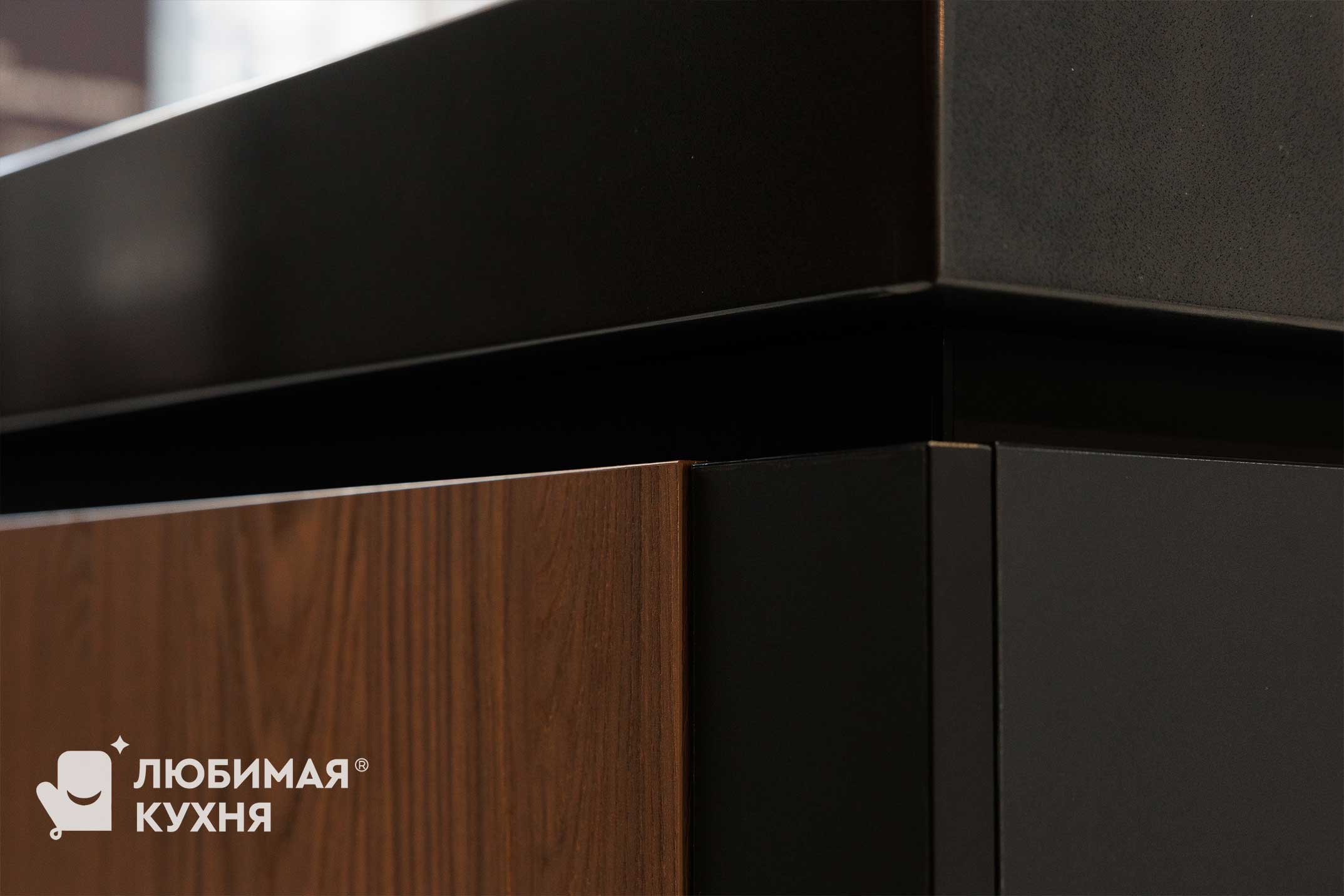верх и пеналы фасады Mattelux Черный премиум, низ ЛДСП H1386 ST40 Дуб Кассела коричневый, витрины профиль алюминиевый ЧЕРНЫЙ ,стекло тонированое Графит