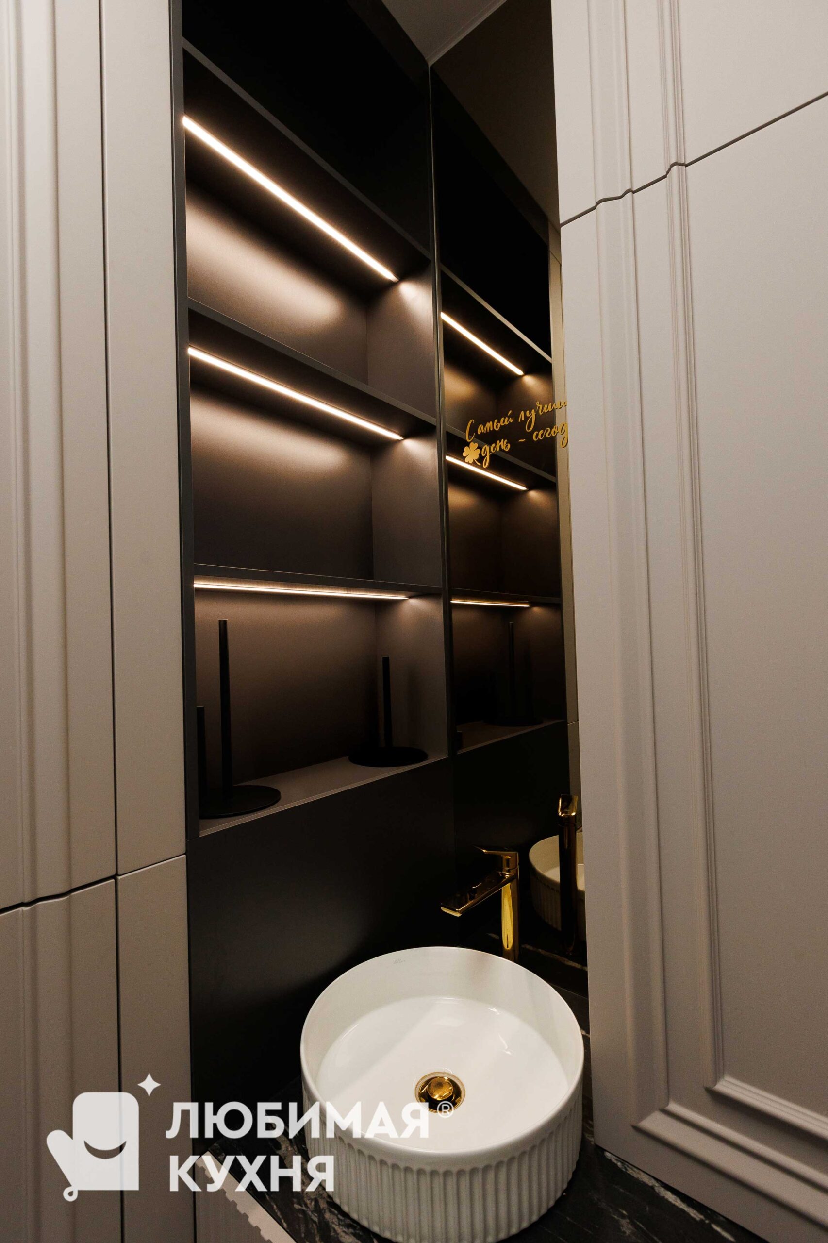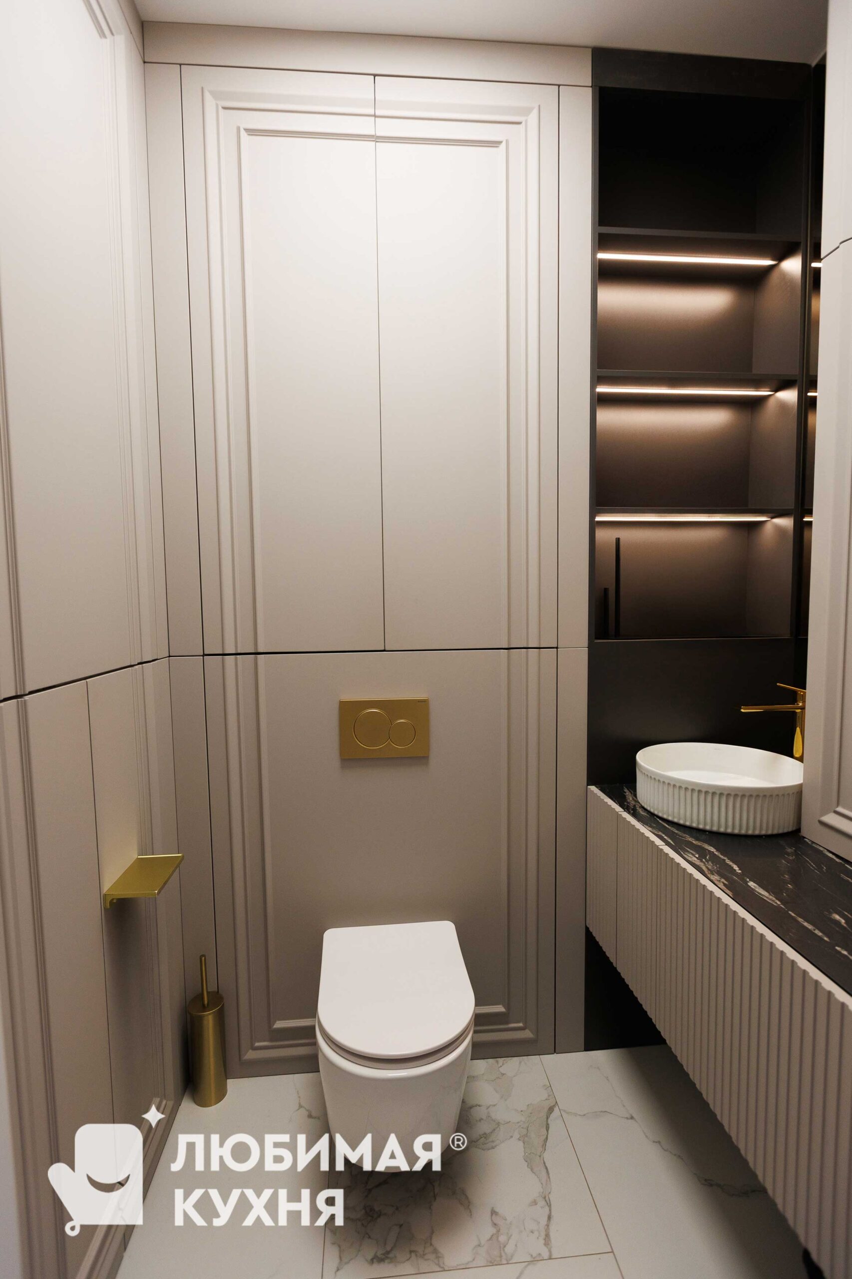 Элегантная мебель для санузла в неоклассическом стиле с фасадами мягкого кремового оттенка. Встроенный шкаф-пенал с фрезерованными фасадами скрывает инсталляцию и обеспечивает вместительное хранение. Контрастная тумба под раковину с рифленым фасадом и столешницей из чёрного мрамора с белыми прожилками создаёт изысканный акцент. Настенные полки с тёплой подсветкой за тонированным стеклом добавляют глубину пространству. Золотистая фурнитура, смеситель и аксессуары подчёркивают премиальный характер интерьера.